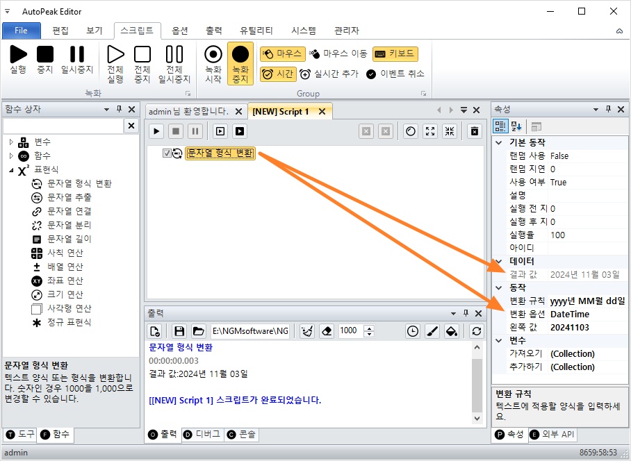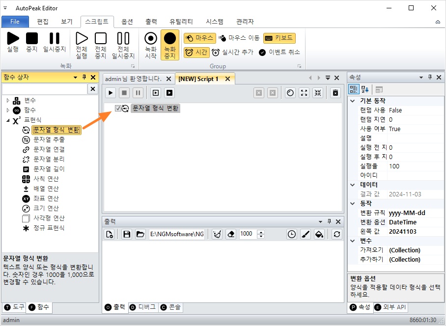 - 표현식 카테고리 확장 → 문자열 형식 변환 액션 더블 클릭
