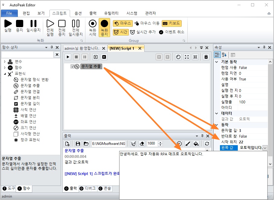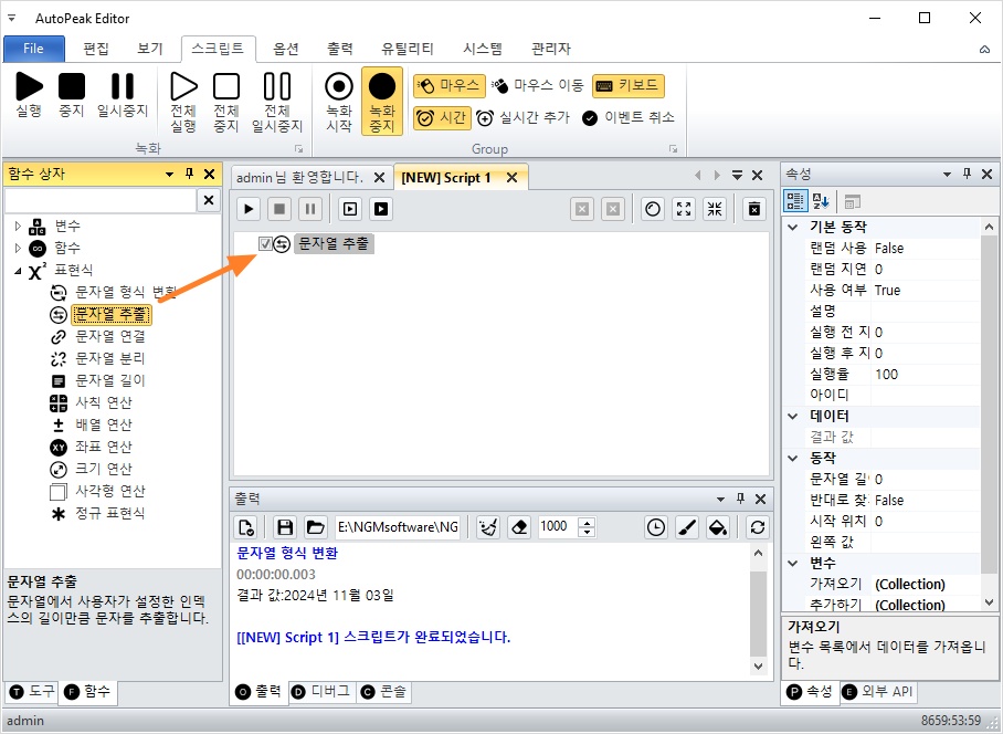 자동으로 스크립트가 생성되고 문자열 추출 액션이 추가됩니다.