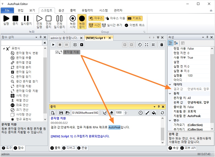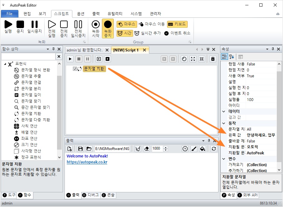 표현식 탭을 확장하고, 문자열 치환 액션을 더블 클릭해서 스크립트에 추가 해보세요.