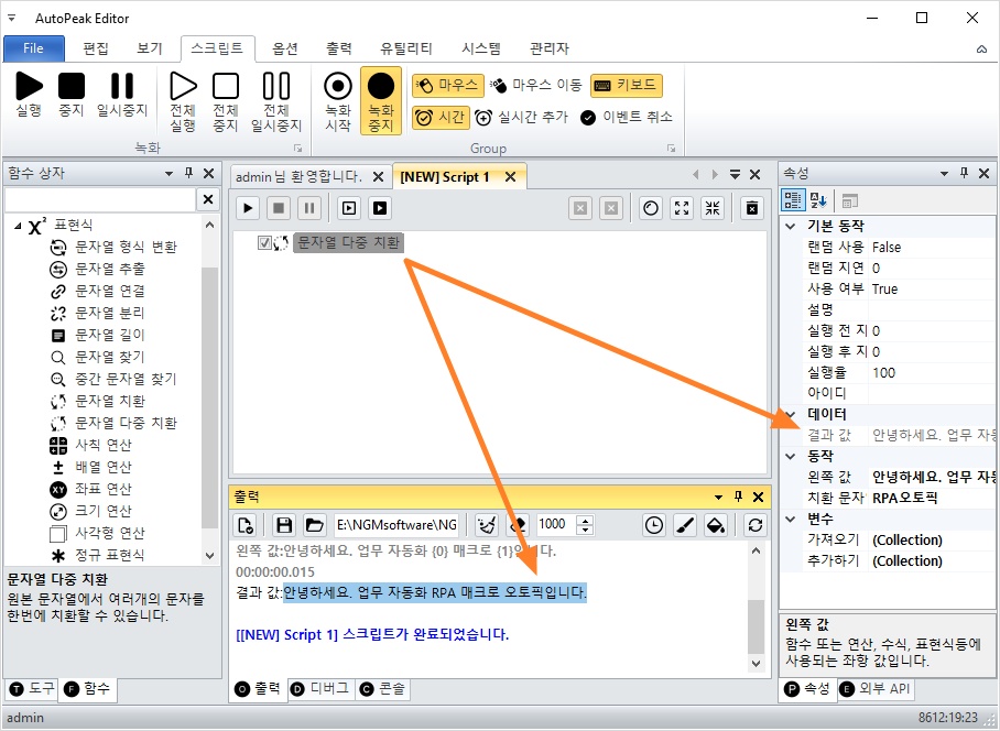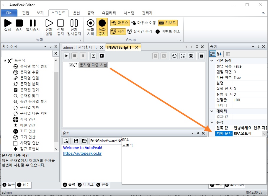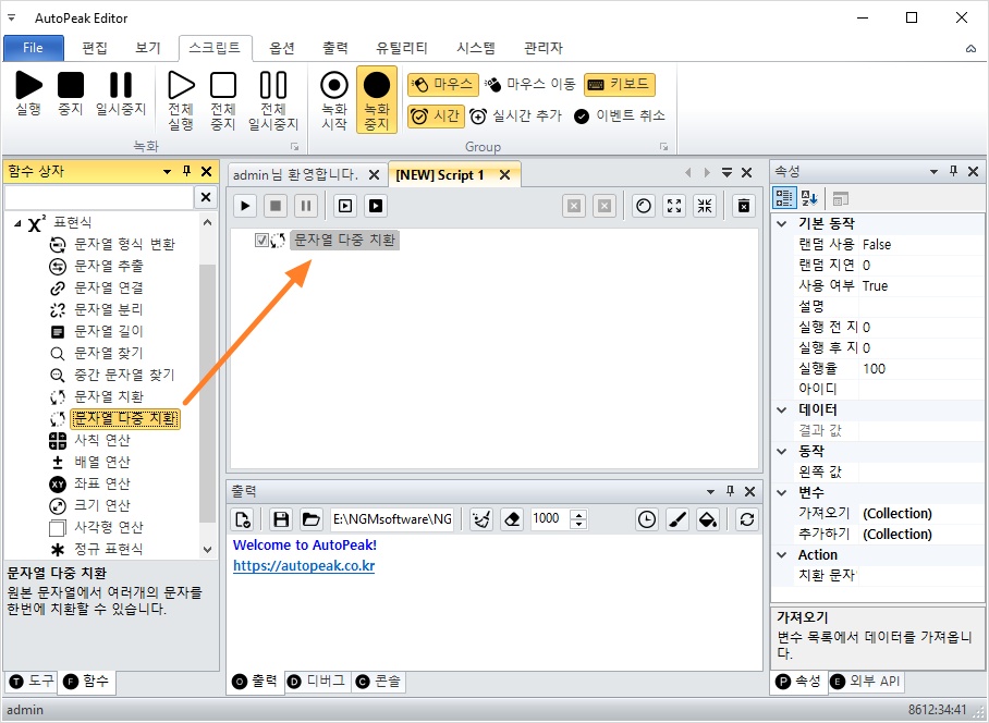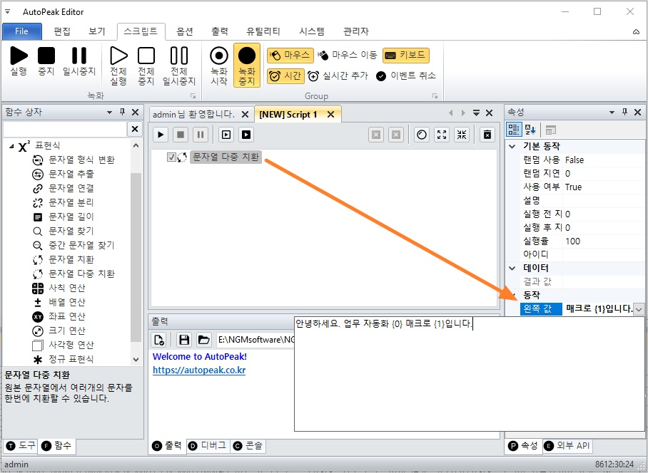 표현식 카테고리를 확장하고 문자열 다중 치환 액션을 더블 클릭해서 스크립트에 추가하세요.