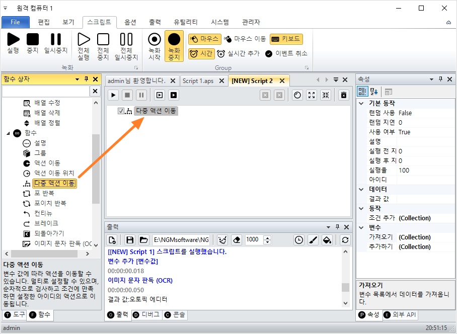하지만, 다중 액션 이동은 이미지 조건과 같은 것들은 사용할 수 없고, 변수에 저장된 데이터를 비교해서 다양하게 액션 루틴을 이동시킬 수 있습니다.