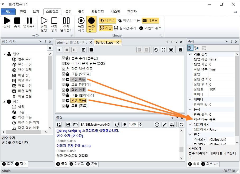 이 스크립트를 테스트하면 변수의 값에 따라서 액션 루틴이 이동하는걸 확인할 수 있습니다.