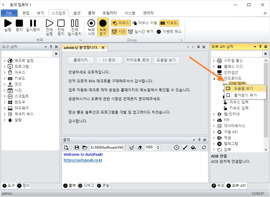 그리고, ADB 연결 액션에서 우클릭한 후 도움말 보기를 선택하세요.