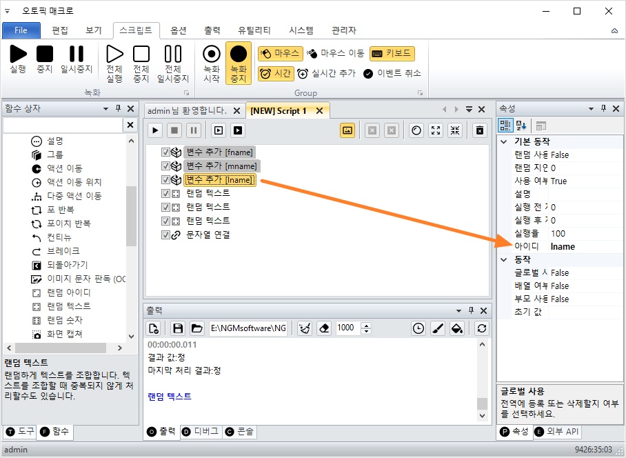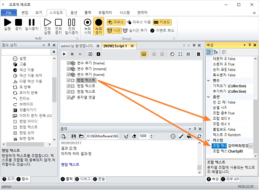 이 액션은 이름의 첫번째, 두번째, 세번째 글자를 랜덤하게 추출하기 위해 사용합니다.
