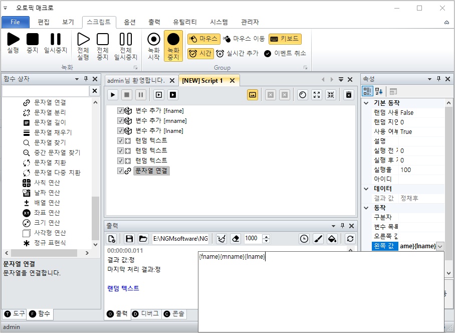 [ 문자열 연결 ] 액션을 추가하고, 아래 그림과 같이 변수 이름을 적어주세요.