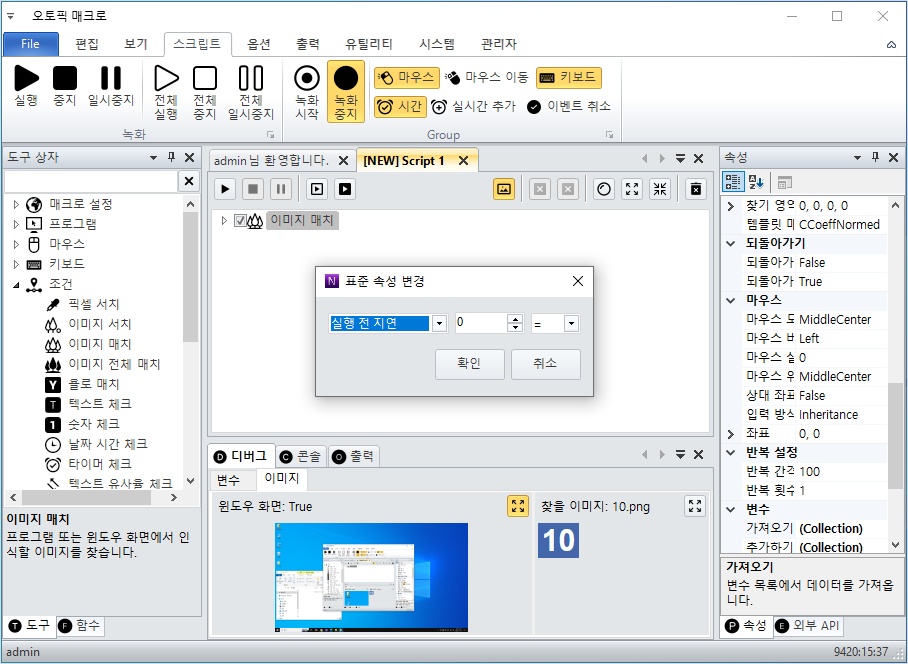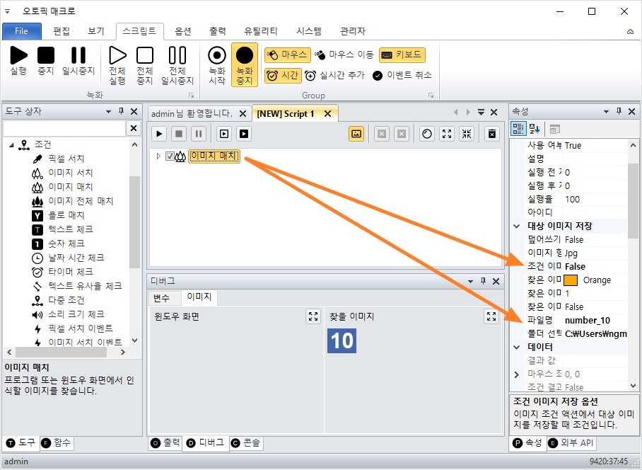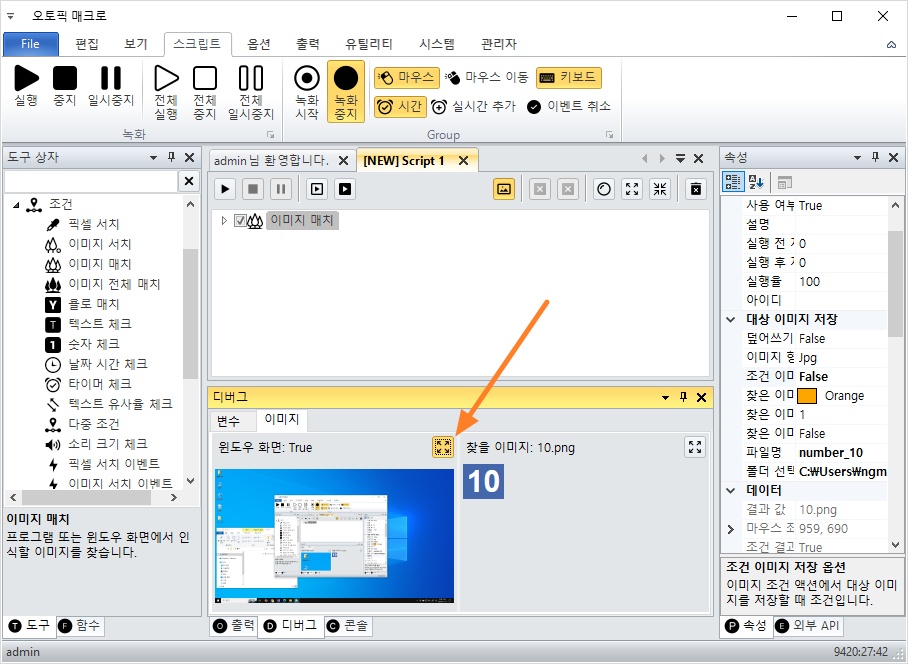 그렇다보니 10이라는 숫자 이미지가 실제 이미지 조건이 실행될 때 화면에 존재했는지를 확인해야 합니다.