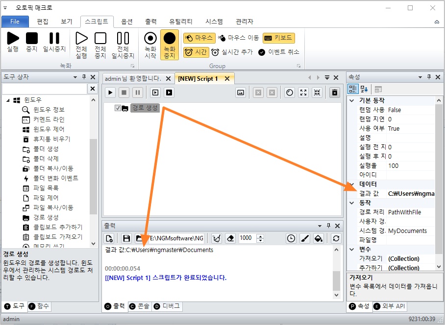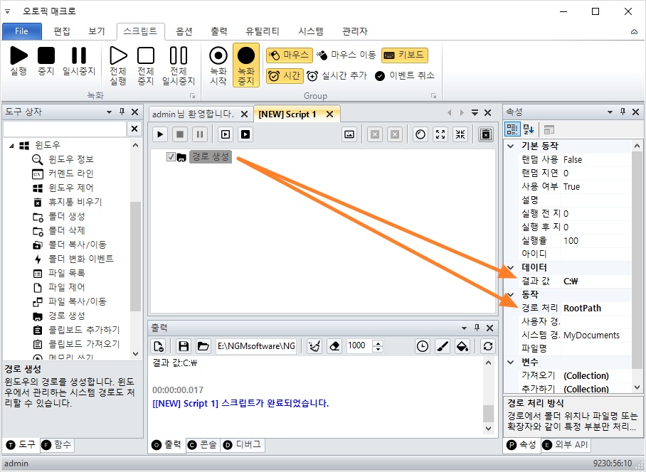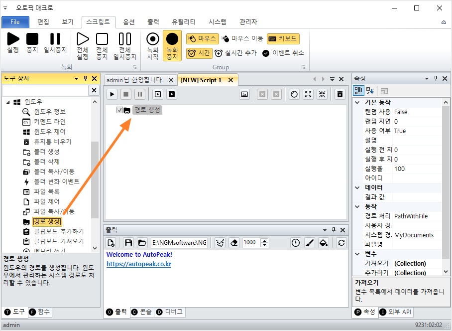 아래 그림과 같이 도구 상자의 윈도우 카테고리에 경로 생성 액션을 추가하세요.