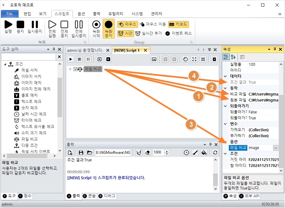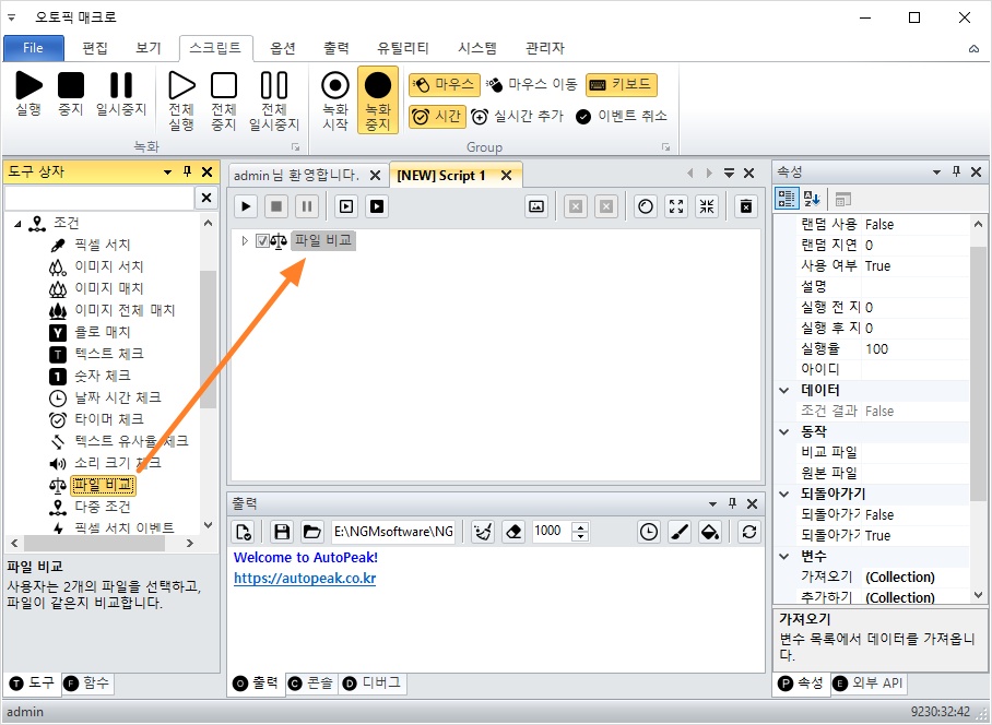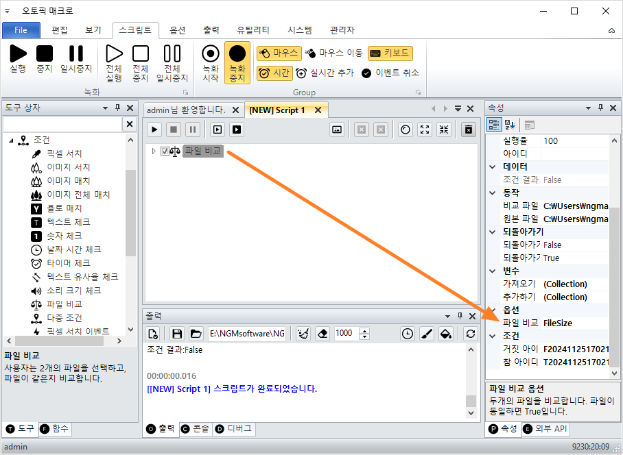 조건 카테고리를 확장한 후 아래로 좀 내려보면 파일 비교 액션이 있습니다.