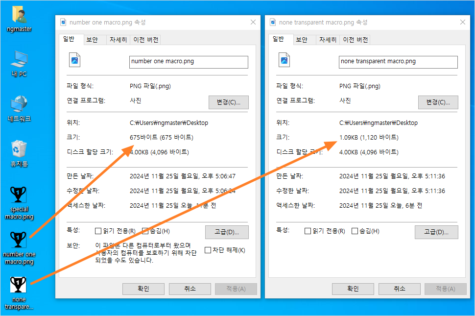 아래 그림을 보면 투명도가 사라진 다시 말해서 투명 위치의 값이 흰색으로 채워진 이미지가 파일 크기가 더 큽니다.
