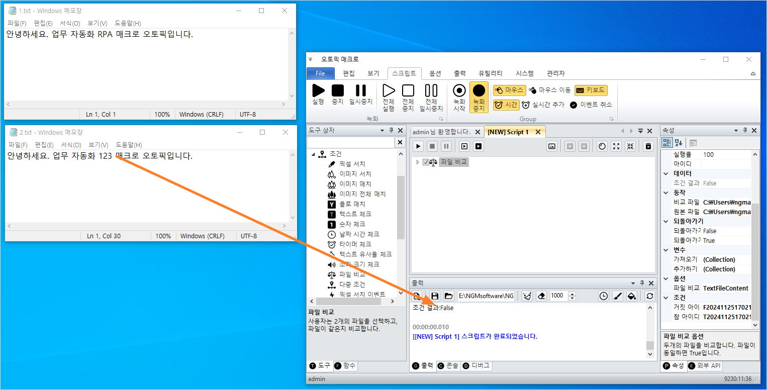 매크로를 다시 실행해보면 텍스트 파일의 내용이 서로 다르기 때문에 결과 값은 False가 됩니다.