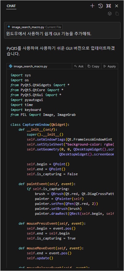 그래서, 인공지능이 만들어준 매크로도 쉽게 캡쳐하고 파일로 저장할 수 있도록 만드는게 좋을것 같습니다.