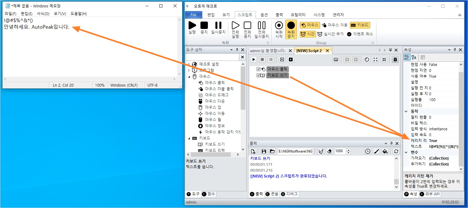 메모장에 텍스트를 입력하기 위해 메모장을 클릭한 후 키보드로 특수문자를 입력하도록 스크립트를 만듭니다.
