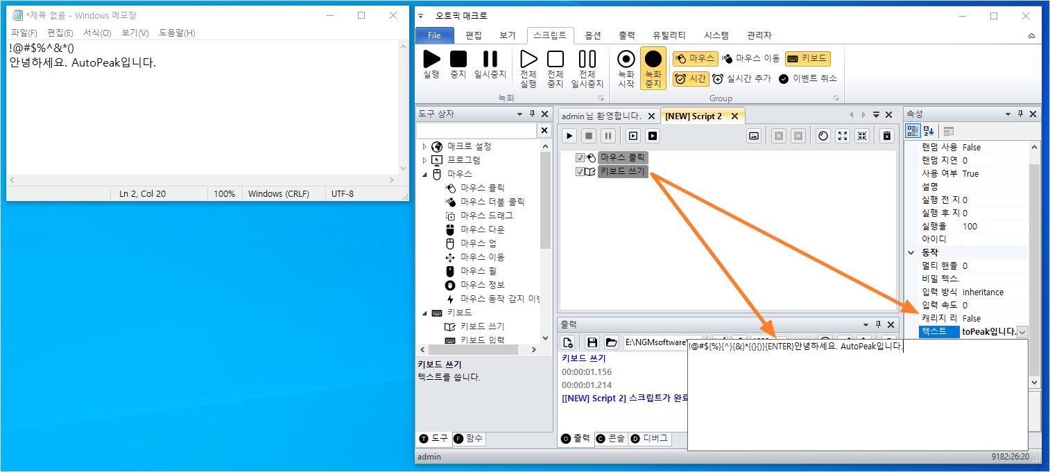 매크로를 실행하고 메모장에 입력된 문자를 확인 해보세요.