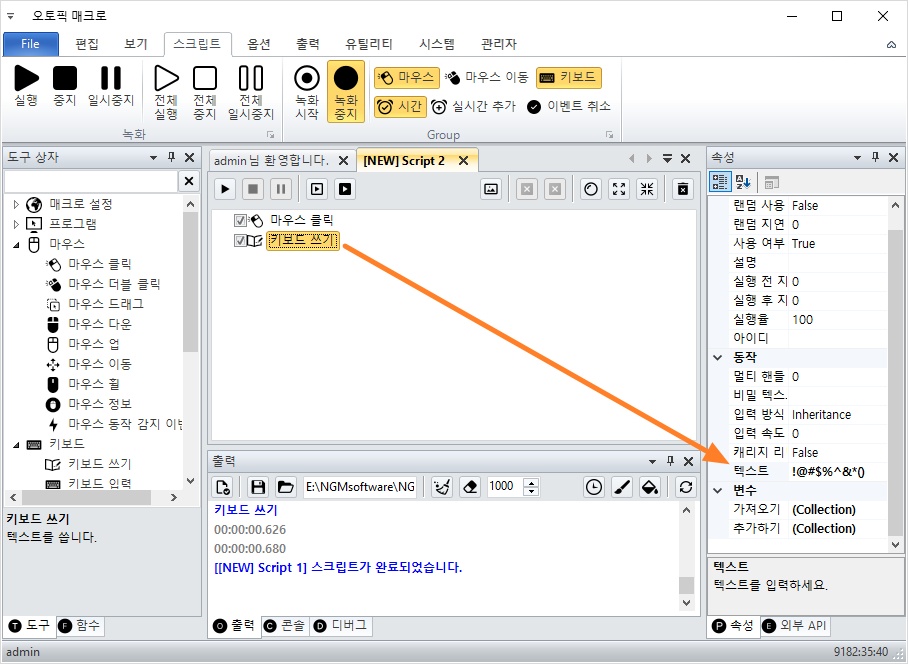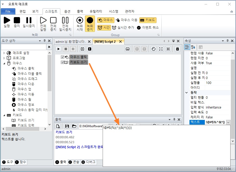 키보드 쓰기의 속성에서 텍스트에 !@#$%^&*() 특수문자를 입력했습니다.