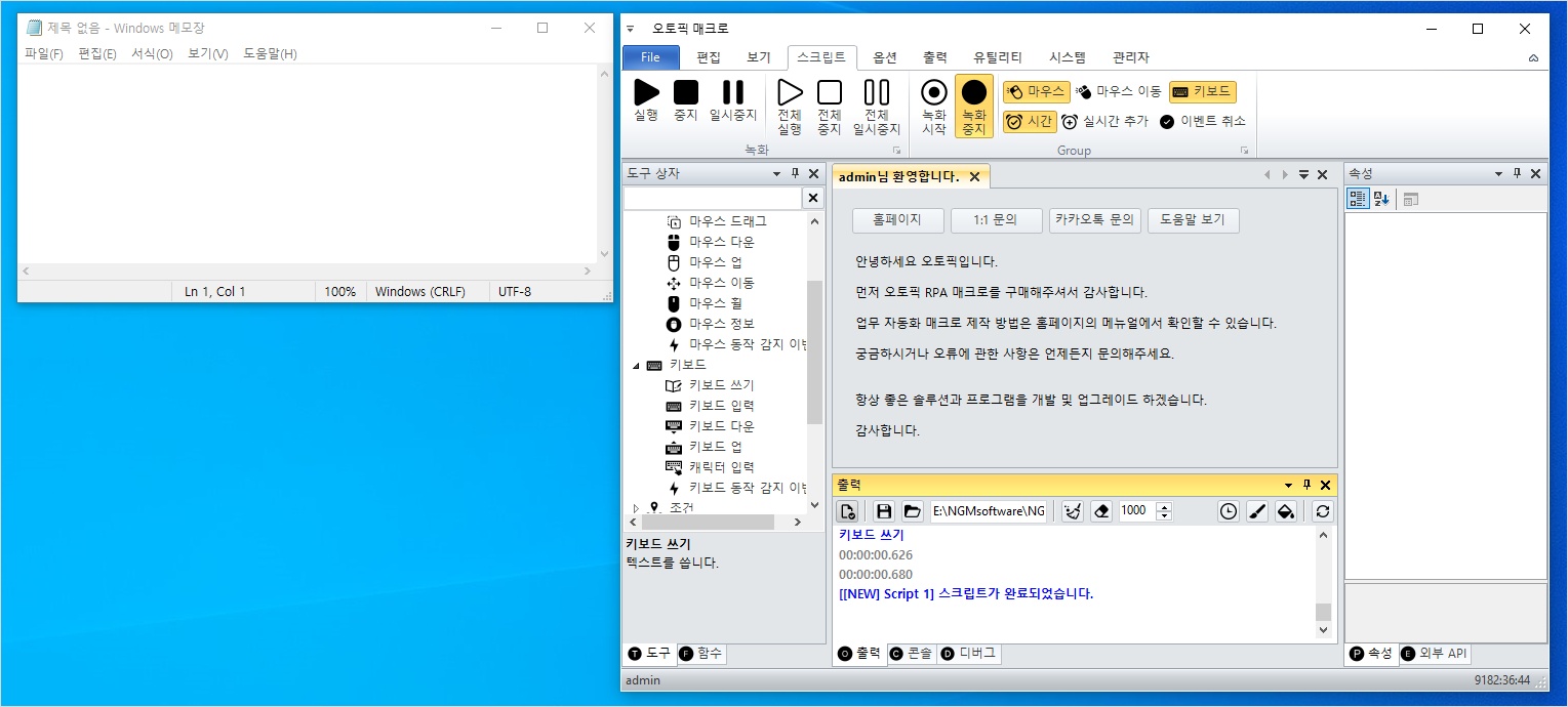 매크로를 실행하고, 메모장에 입력된 결과를 확인 해보세요. 정상 동작하는걸 알 수 있습니다.