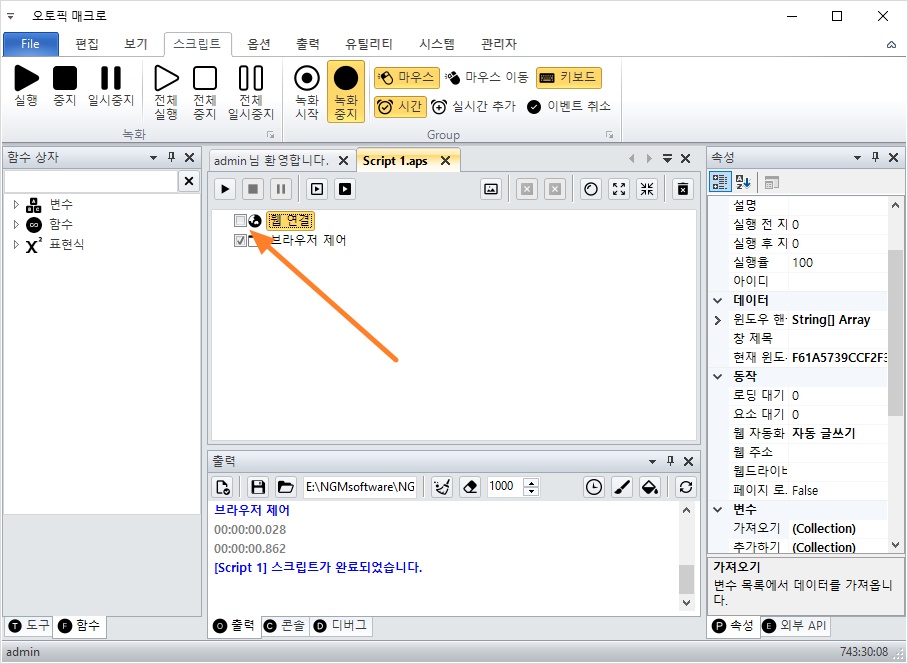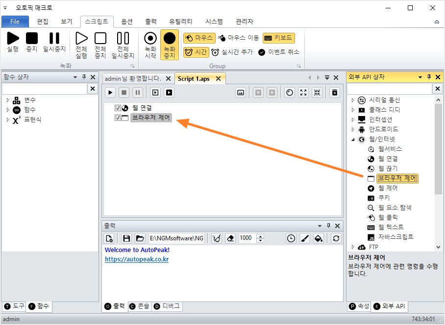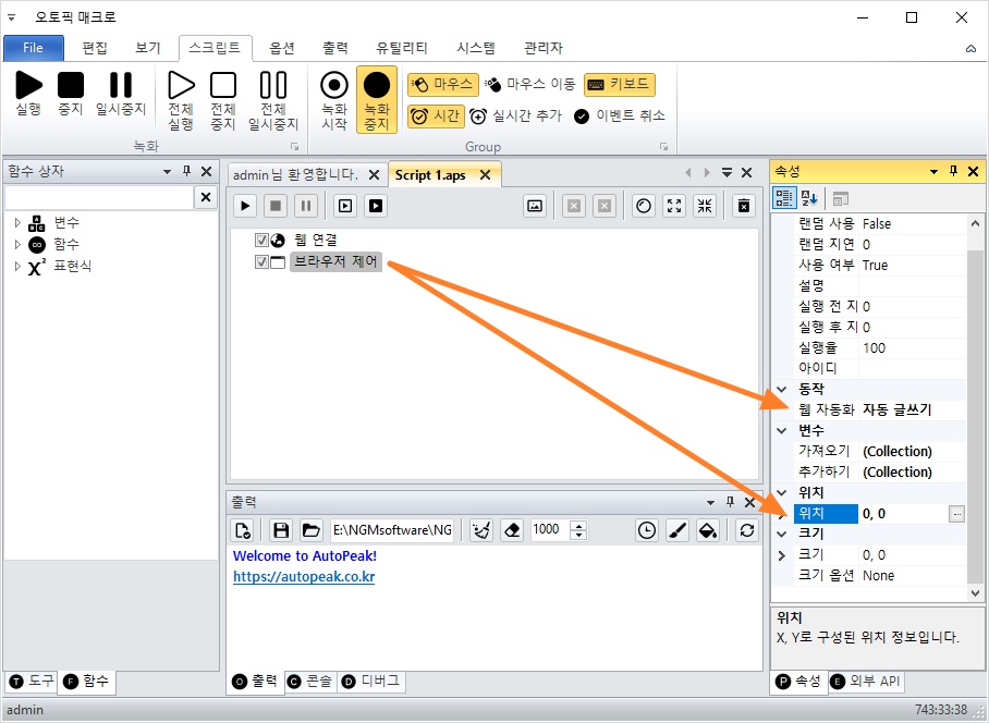 이번에는 브라우저 제어 액션을 추가해서 크롬을 윈도우 화면 기준 왼쪽 위로 이동시키도록 할께요.