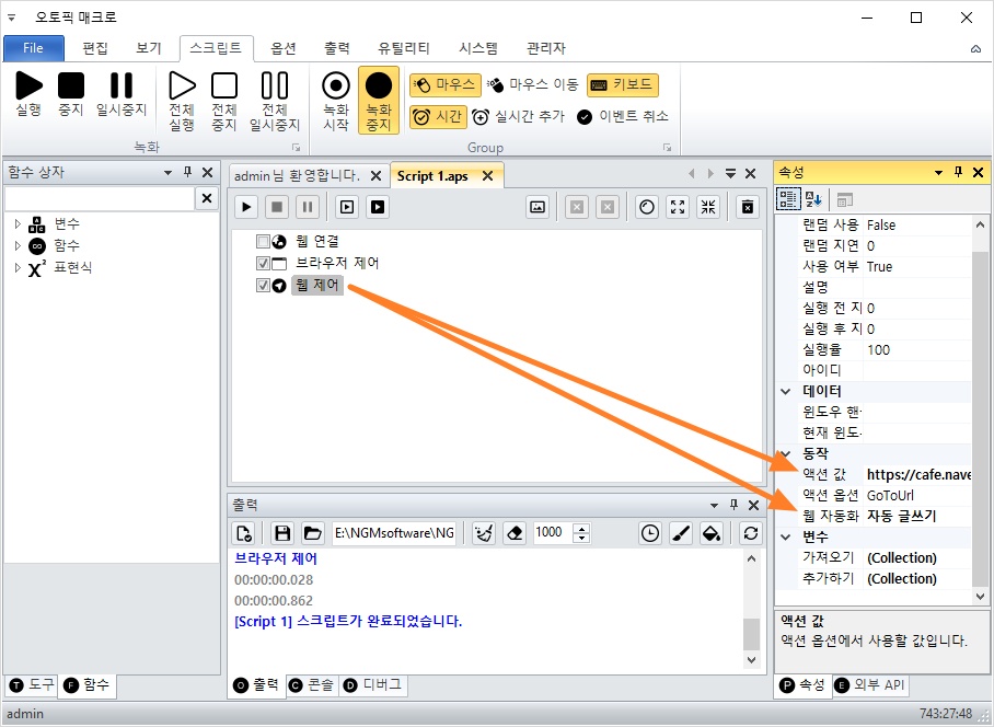 속성에서 웹 자동화 이름을 선택하고, 액션 값에 네이버 카페 주소를 입력하세요.