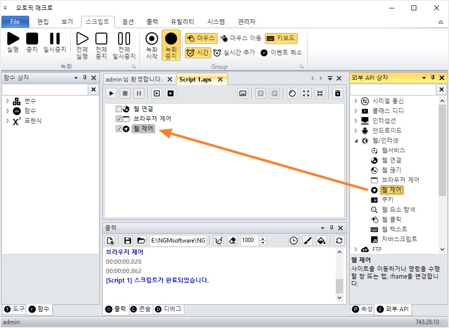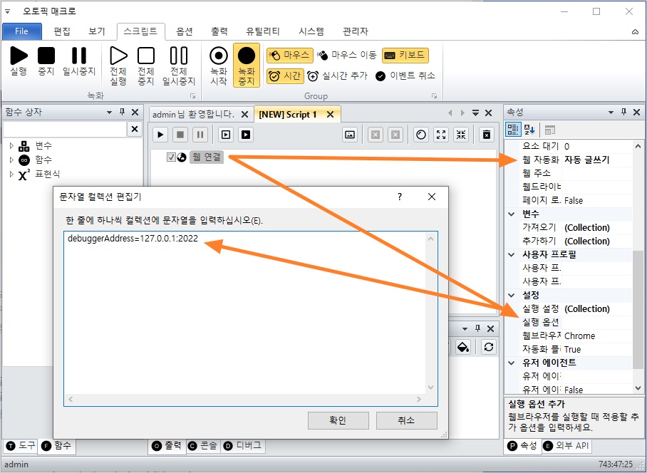 웹 자동화 이름은 연결에서 설정한 이름을 선택하세요.