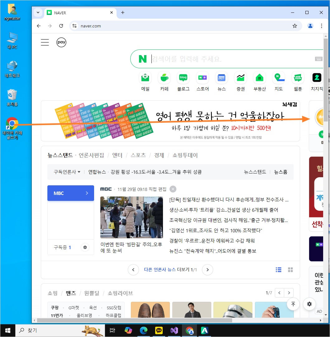크롬 웹브라우저를 닫고 다시 열어서 네이버로 이동 해보세요.