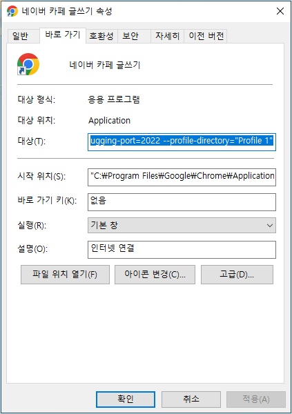 여기서 뒤에 2022는 위에서 크롬 속성에서 설정한 포트와 동일해야 합니다.