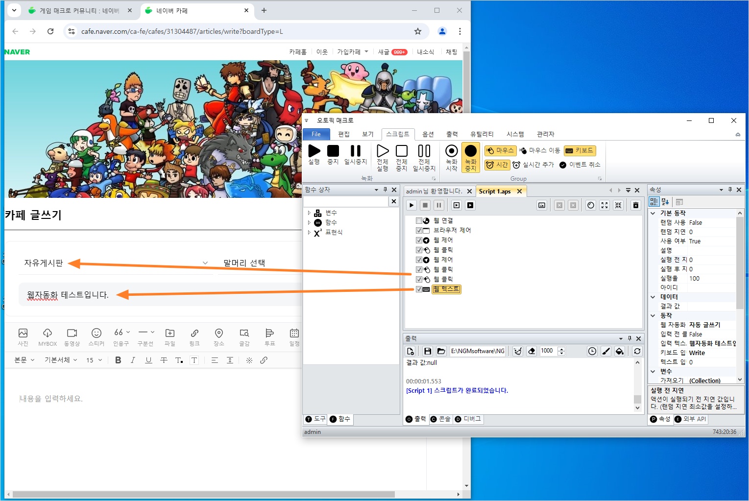 매크로를 실행하면 네이버 카페에 들어가서 글쓰기 버튼을 클릭한 후 게시판 선택과 글 제목을 입력하게 됩니다.