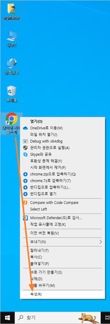 우선, 구글 크롬의 바로가기 아이콘을 윈도우 바탕화면에 하나 복사한 후 우클릭해서 속성을 선택하세요.