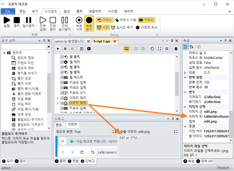 이와 동일하게 편집 이미지도 설정한 후 왼쪽 클릭하게 해줍니다.