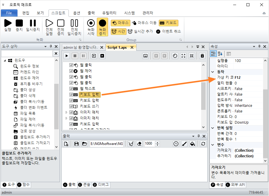 키보드 입력 액션을 추가하고, F12를 누르도록 설정하세요.
