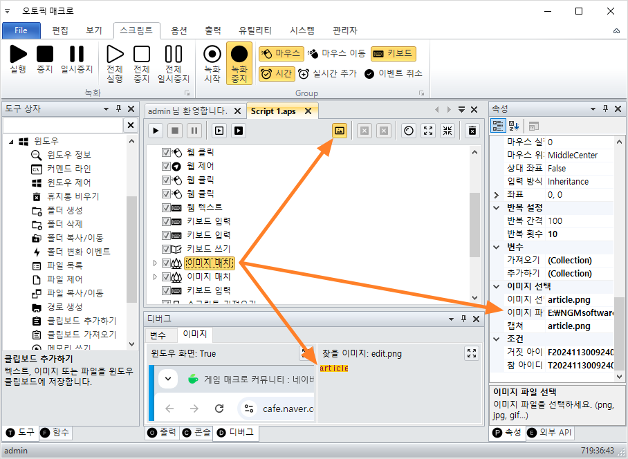 아티클 엘리먼트를 찾았으면 이미지 매치로 해당 이미지를 우클릭 하도록 설정합니다.