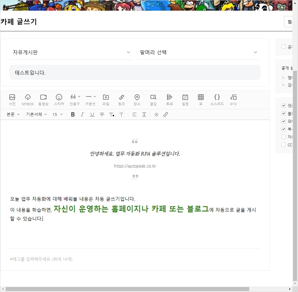 | 네이버 카페 자동 글쓰기 매크로 | 오토픽(AutoPeak) RPA 매크로 활용법 (1) | 2025.08.18 |