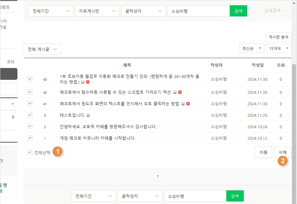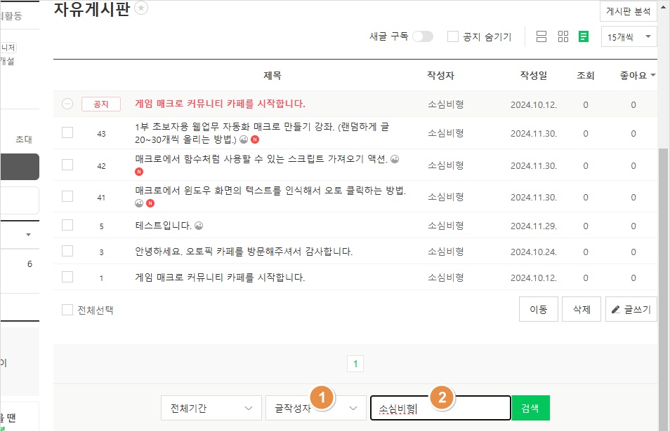 웹 브라우저에 연결되고, 네이버 카페로 이동합니다. 그리고, 자유 게시판을 클릭한 후 콤보 박스에서 글작성자를 선택합니다.