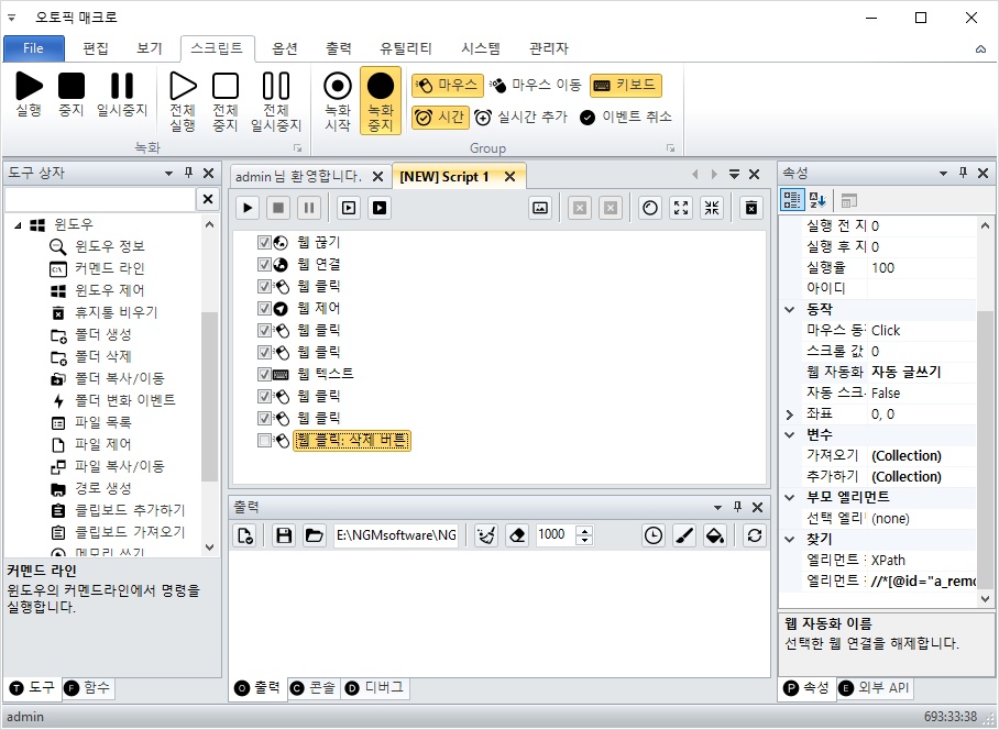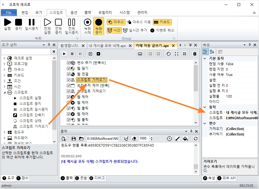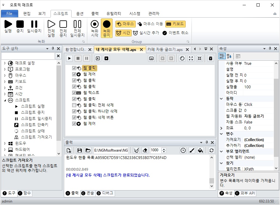 매인 스크립트에 웹 끊기와 웹 연결 액션이 이미 존재하기 때문에 내 게시글 모두 삭제.aps 파일에서 2개의 액션을 삭제합니다.