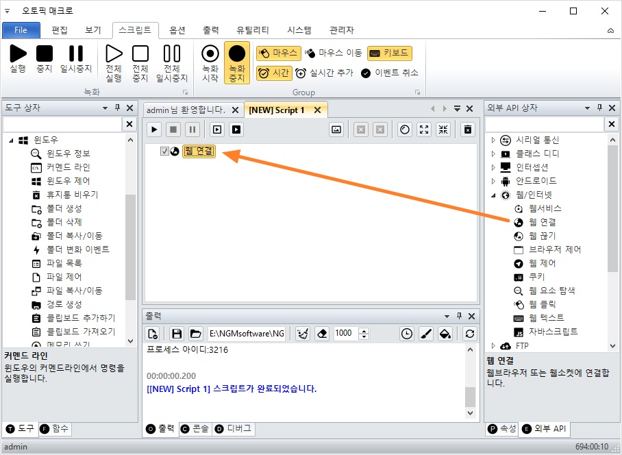 오토픽 매크로를 실행하고, 웹 연결 액션을 추가하세요.