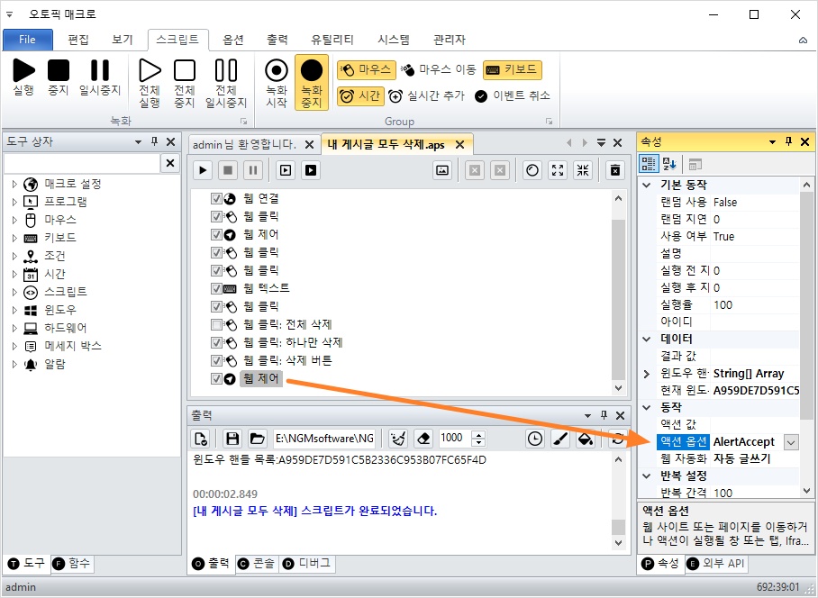 얼럿창에서 삭제 버튼을 클릭하도록 웹 제어 액션을 추가하세요.
