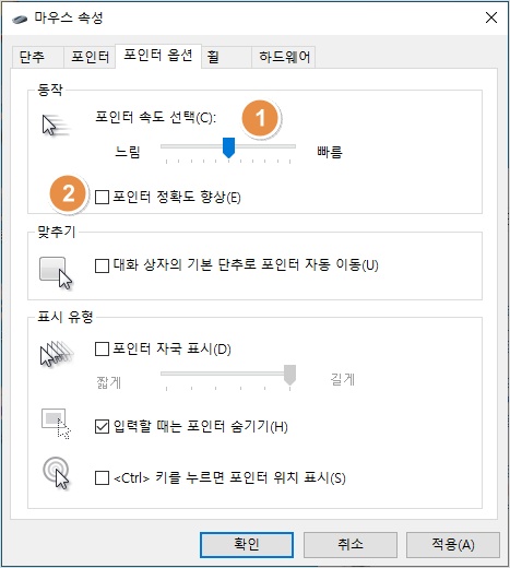 ①포인터 속도 중간으로 놓고, ②포인터 정확도 향상을 끄고 사용하세요.