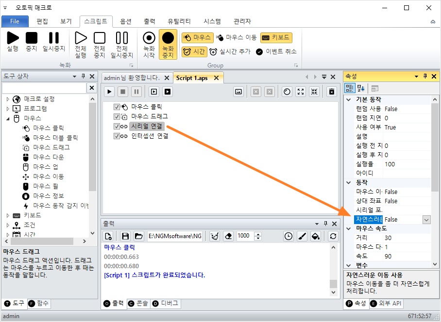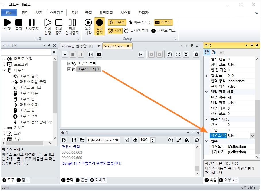 자연스러운 마우스 이동 기능은 마우스 동작에서 이동 옵션이 있는 모든 액션에서 사용할 수 있습니다.