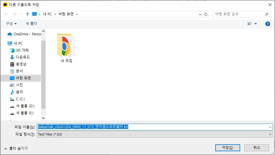 카톡방에서 콘트롤+S를 누르면 아래와 같이 파일 저장 창이 표시됩니다.