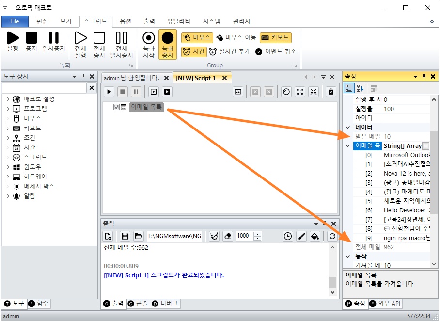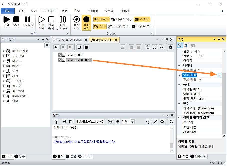 매크로를 실행하고 이메일 내용 목록 액션의 속성에서 이메일 목록을 클릭 해보세요.