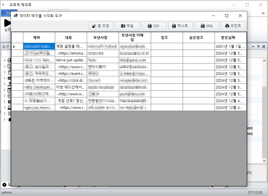 데이타 테이블 시각화 도구가 표시되고, 이메일의 여러가지 내용을 확인할 수 있습니다.