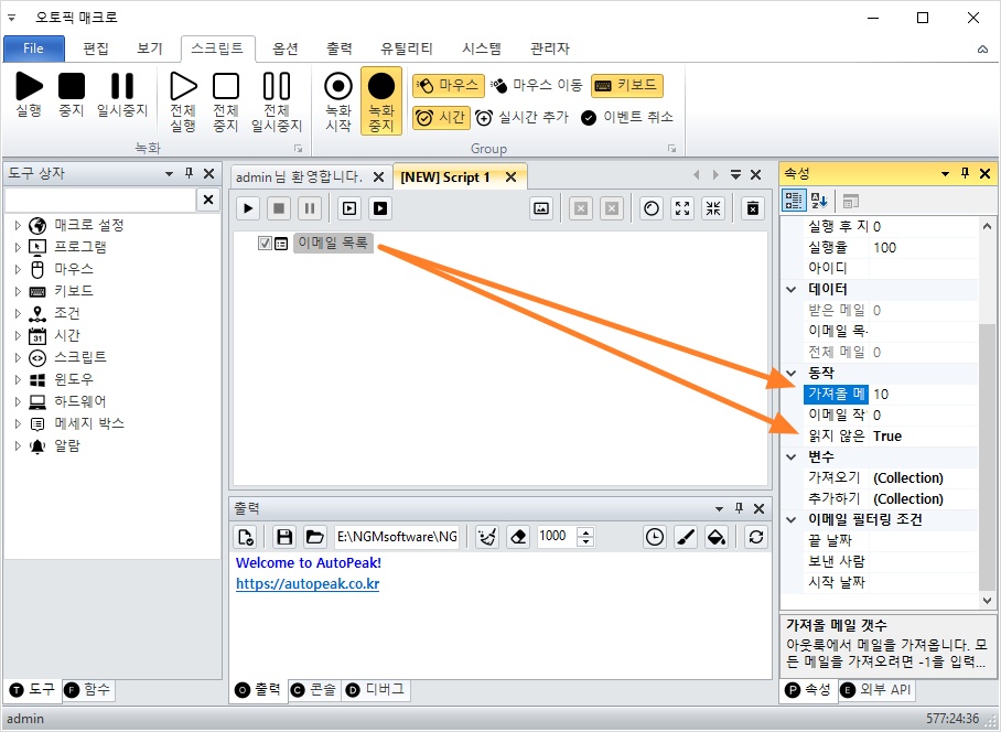 속성창의 읽지 않은 메일만을 True로 변경하고 가져올 메일 갯수를 10으로 설정하세요.
