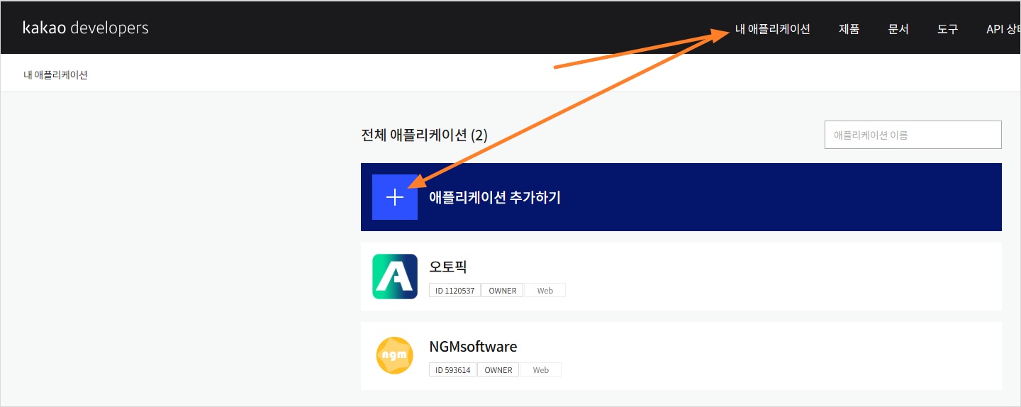 내 애플리케이션을 클릭하고, 애플리케이션 추가하기를 클릭하세요.