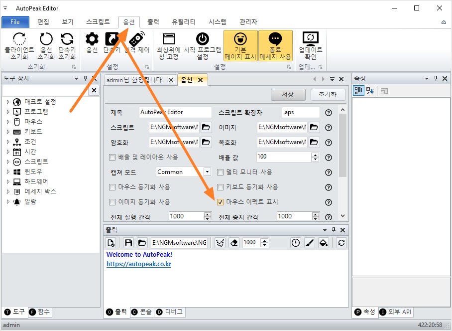 그리고, 옵션에서 마우스 이펙트도 사용으로 변경하세요.