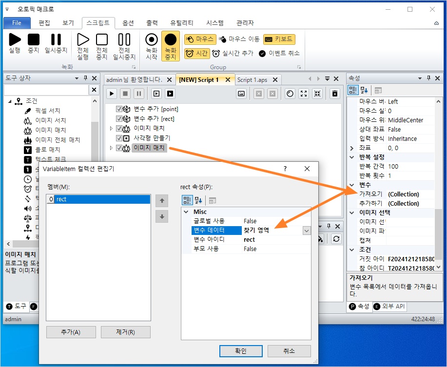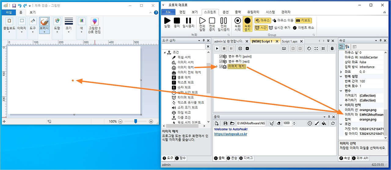 - 도구 상자 → 조건 > 이미지 매치 액션 추가