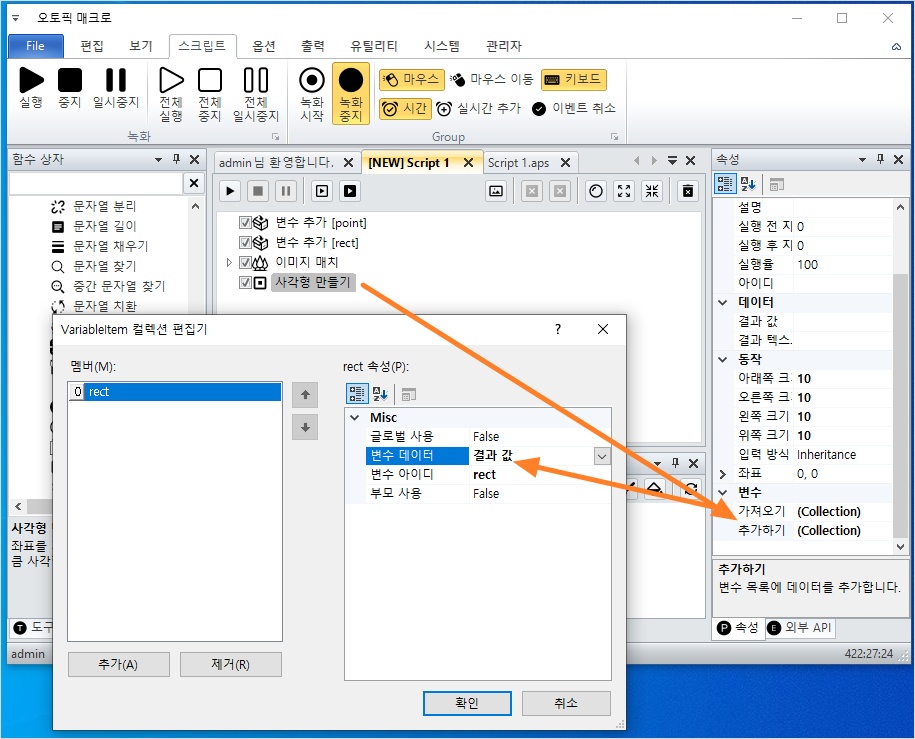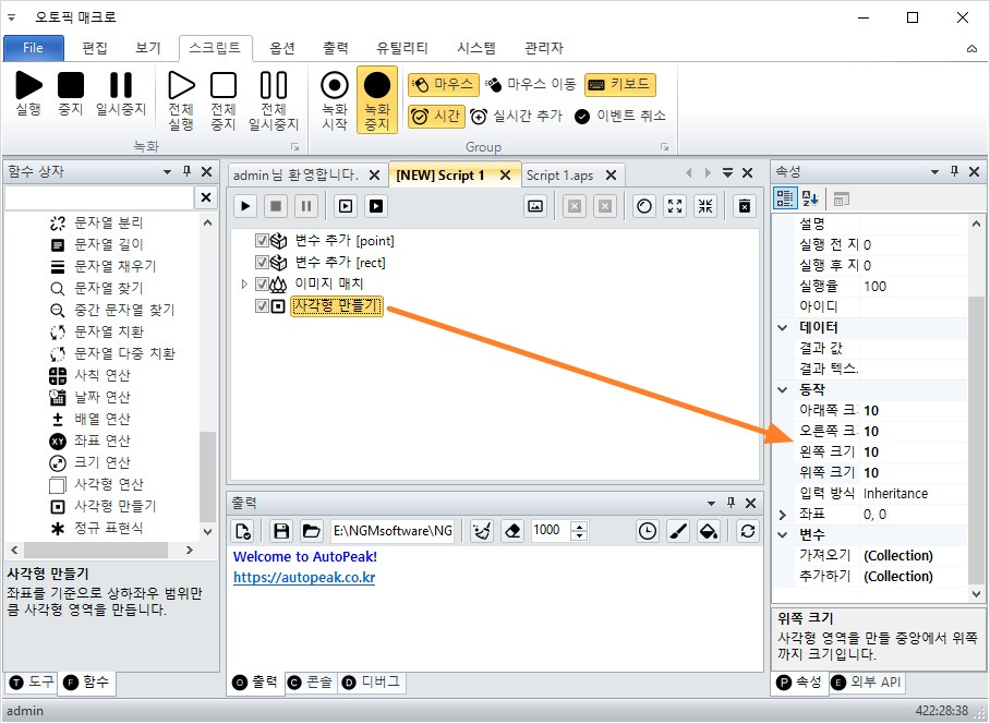 - 도구 상자 → 함수 > 표현식 > 사각형 만들기 액션 추가