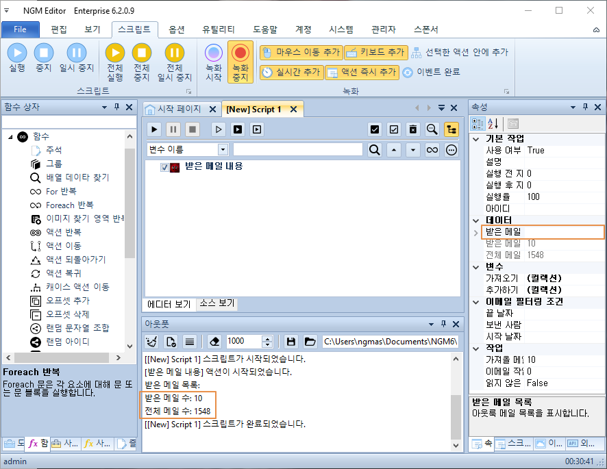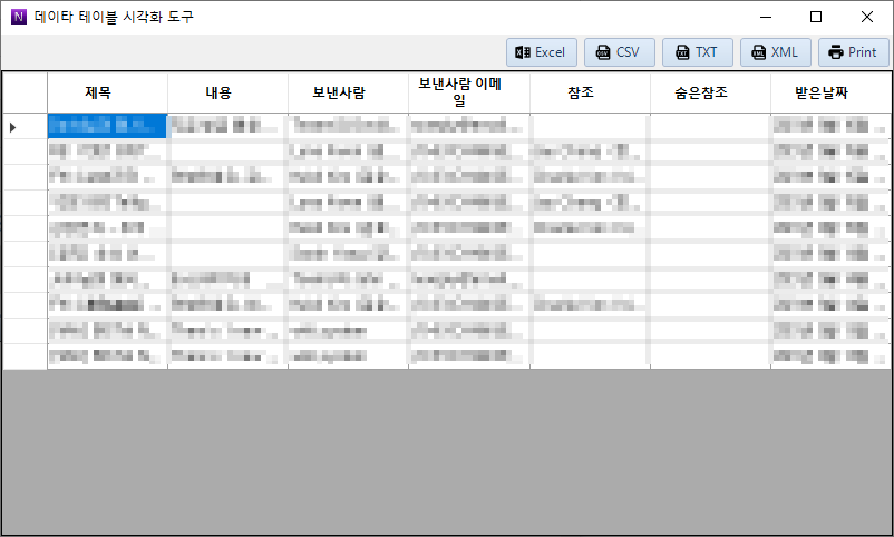 속성에 받은 메일 목록을 클릭하면 데이타테이블을 확인할 수 있습니다. Excel 또는 CSV로 저장할 수 있습니다. Text와 XML로 저장하거나 연결된 프린터로 출력할수도 있습니다. 마우스를 셀에 올리면 전체 내용이 Popup으로 표시됩니다. 데이타테이블로 저장되기 때문에 [ Foreach 반복 ] 액션을 사용하면, 데이타테이블의 내용들을 전부 사용할 수 있습니다. 제목뿐만 아니라 내용에서도 특정 키워드를 추출하거나 필터링할 수 있습니다. 참조 또는 숨은 참조에 있는 사용자도 확인할 수 있습니다.