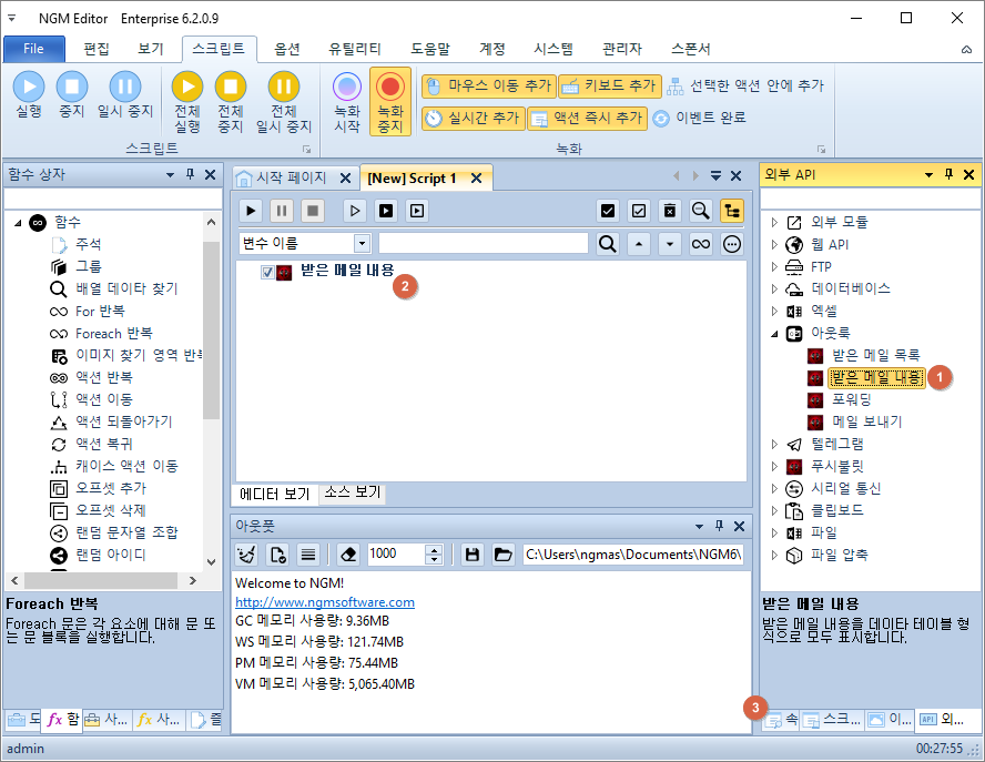 안녕하세요. 엔지엠소프트웨어입니다. 대부분 Microsoft Office를 사용하고 계실겁니다. 특히나 회사에서 업무용 이메일로 사용하고 있겠죠? 개인은 네이버, 네이트 또는 구글 지메일과 같은 메일 계정을 사용하고 있을겁니다. 아웃룩을 사용하면 좋은점은 외부 메일을 아웃룩과 연동해서 처리할 수 있기 때문입니다. 외부 API > 아웃룩 > 받은 메일 내용을 사용하면 아웃룩으로 받은 메일들을 InBox에서 조회할 수 있습니다. 단순히 제목에서 특정 키워드로 필터링하는 용도는 [ 받은 메일 목록 ] 액션을 사용하는게 좋습니다. 다만, 내용에서 뭔가 처리하려면 이 액션을 사용하세요.