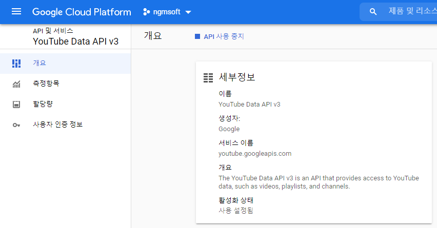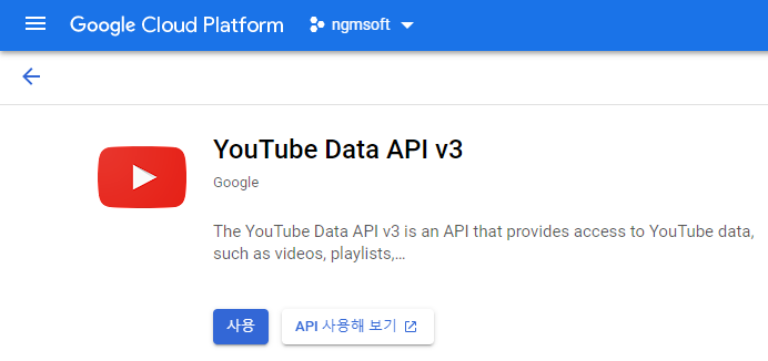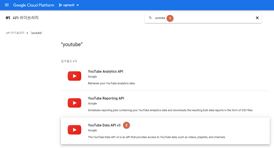 - 검색창에 youtube 입력 후 YouTube Data API v3 선택