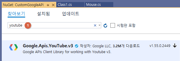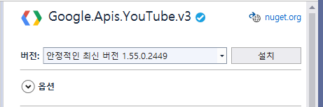 - youtube 검색 → Google.Apis.YouTube.v3 선택 후 설치