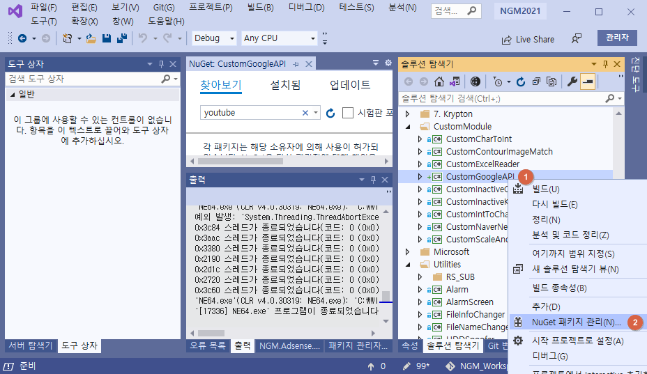 아래 그림과 같이 "솔루션 탐색기 (Ctrl+Alt+L)"에서 "CustomGoogleAPI" 프로젝트를 우클릭합니다. 표시되는 콘텍스트(Context) 메뉴에서 "NuGet 패키지 관리"를 클릭하세요.