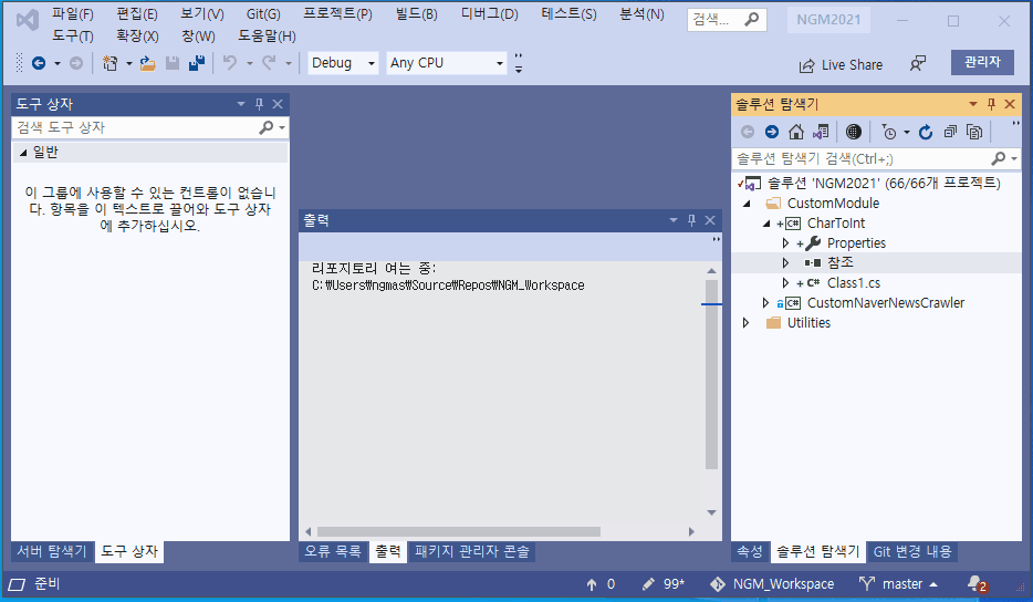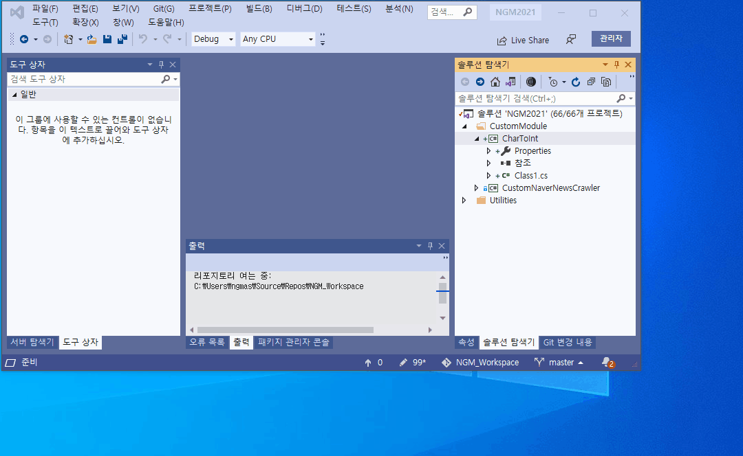 아래 그림처럼 새로운 프로젝트가 생성 되었을겁니다. 여러분들은 아마도~ 아래 그림과는 다를겁니다. 제 경우에는 NGM의 제품 및 기타 개발중인 프로그램들이 모두 표시되어 있습니다. 이제 커스텀 모듈 개발 킷을 프로젝트의 참조에 추가 시켜야 합니다. 아래 동영상을 참고해서 참조에 추가하세요. 참고로, 바탕화면에 커스텀 모듈 개발 킷(3개)을 복사해두고 참조에 추가 했습니다.